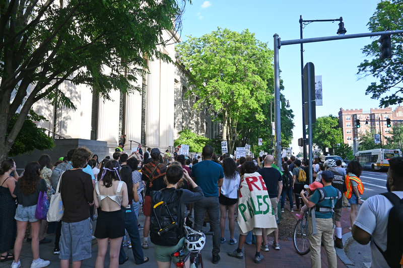 May 28, 6:36 PM: Members of the GSU and supporters gather to protest the punishment of pro-Palestinian protesters