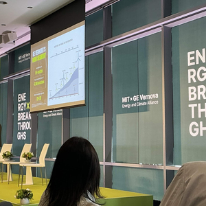 Charudatta Mehendale (left) opens the Wind Innovation panel of the MITxGE Vernova Energy Symposium on Wednesday, Feb. 11, 2026.