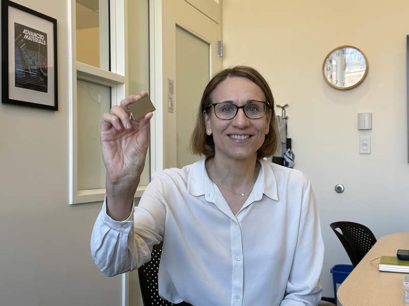 Ana Jaklenec holding up a silicon wafer to be used as a mold for polyanhydride cups to hold vaccine antigens.