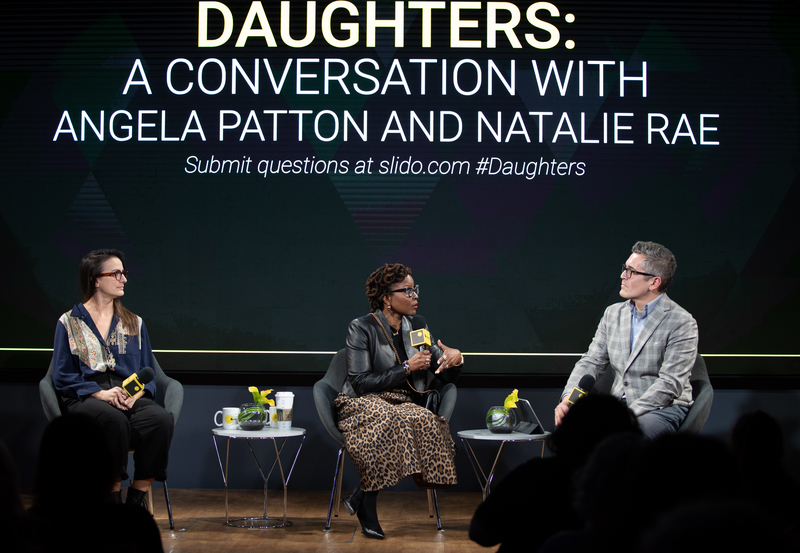 WBUR reporter Simón Rios (right) hosts a conversation with ‘Daughters’ documentary directors Natalie Rae (left) and Angela Patton (center) at WBUR CitySpace on Friday, March 27, 2026.
