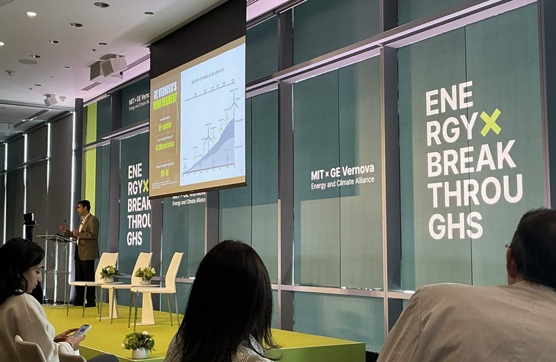 Charudatta Mehendale (left) opens the Wind Innovation panel of the MITxGE Vernova Energy Symposium on Wednesday, Feb. 11, 2026.