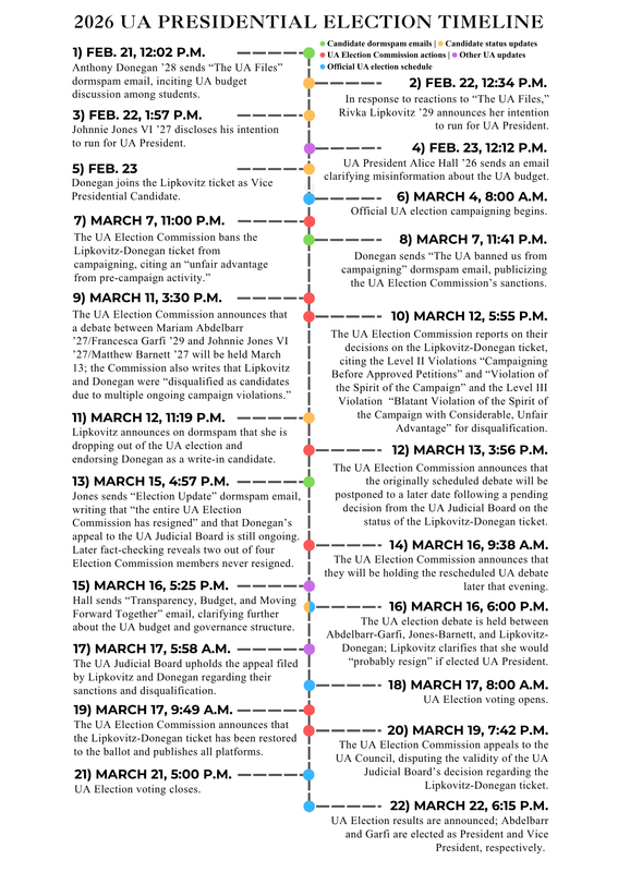 Timeline of the 2026 UA presidential election, including key events, candidacy updates, and the election schedule. Grace Zhang–The Tech