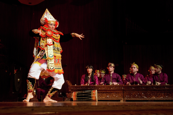 Gamelan Galak Tika performed on Saturday night in Kresge auditorium. Pictured, Shoko Yamamuro performed a traditional warrior dance. Gamelan is a type of complex percussion music based on pentatonic scales, used in Hindu rituals in Bali.
