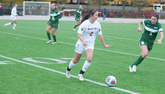 Amy A. Apostol ’19 dribbles the ball during last Saturday’s game against Babson College. Apostol scored the opening goal at the 10-minute mark and the MIT Engineers beat Babson 2-1.