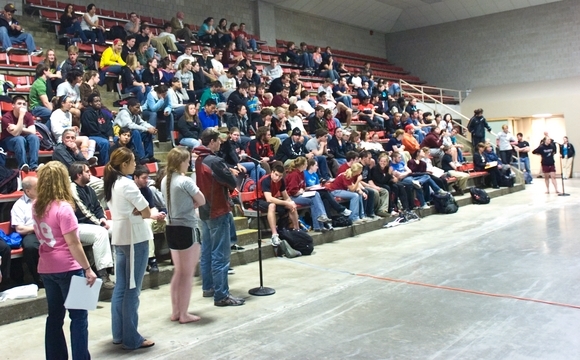 At a town hall meeting, one student said her team would be happy to do more with less — she would rather accept a drastic budget cut than lose varsity status.