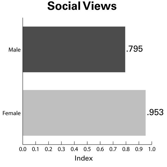 Where does this difference come from? When asked to rate their fiscal views, male’s responses averaged to -.058, with zero representing a response of “Moderate” and -1 representing a response of “Conservative.” Women, in contrast, averaged to .107, with 1 representing a response of “Liberal.” Both are clustered fairly close to an overall “Moderate” stance, but these differences are statistically significant — men are fiscally more conservative than women (and overall, men are very slightly leaning conservative in a fiscal sense). In a social sense, men achieved an index of .795 and women .953, both pretty close to a response of “liberal.” In general, then, men are more conservative than women in both the social and fiscal spheres, but on the whole, both MIT men and women are quite liberal in a social sense.