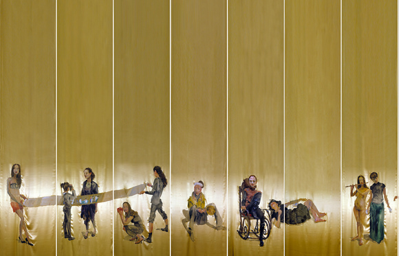 Much of the impact relies on the sheer scale of the works. Nearest to the entry is Yu Hong’s Spring Romance (2007-9), a set of eight hanging silk banners with figures of women from all parts of the modern city painted in broad brushstrokes, but delicate all the same, on the surface. Liu Dan’s Ten Differentiated Views of the Honorable Old Man (2007-10) consists of a temple-like display of nine hanging scrolls hung in a near-semicircular fashion around the said Honorable Old Man Rock (collected during the Ming Dynasty) and lit so that each ink drawing, meticulously executed and almost the same as the next, has a personality of its own. Building on this play between paper and sculpture is Qin Feng’s Civilization Landscape (2007-10), a theatrical display involving a journey through ten massive, accordion-format books, and the eventual arrival at a stage consisting of seven hanging scrolls and the work that inspired it all, a ceremonial bronze wine vessel from the early 10th century BC.