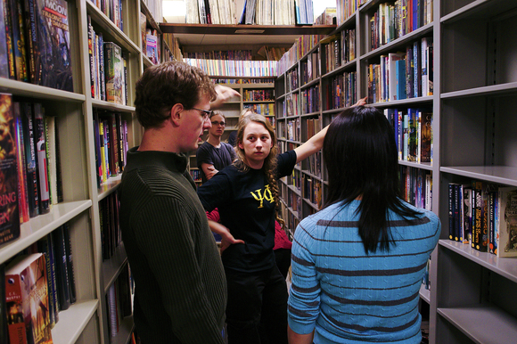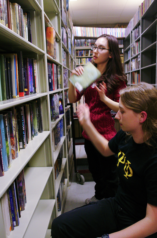 Alexandra M. Westbrook ’13 (right) passes a book to Cathleen E. Nalezyty ’16 as the two “bubble” the books toward the far end of the shelves, in essence propagating the free space toward the near end of the row of shelves. The bubbling process served both to compress books on the shelves — after bubbling, wide books would typically be oriented to face outward, leaving more space for other books behind them — and to coalesce open shelf spaces in order to avoid “gotos” — points where the logical continuation of a set of books was located in a disjoint location in the library.