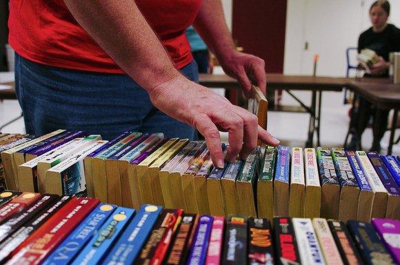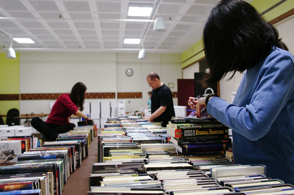 Andrew M. Boardman thumbs through a set of paperbacks, looking for the proper spot for a book. At times, the similarities among last names of different authors made the merge process time-consuming and error-prone. For instance: Dick vs. Dicks vs. Dickson vs. Dickinson.