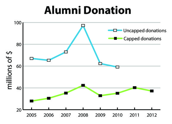 From FY2005 to FY2008, MIT’s capped donations from alumni donors increased from $28 million to $42.3 million, taking a dip in FY2009 to $32.9 million, in line with the global recession. Alumni donations and participation then increased again through 2011, but both figures dropped again in FY2012, as aforementioned.