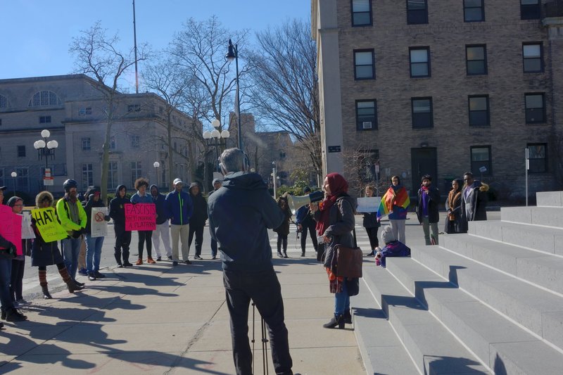 Protestors gathered outside the Media Lab while Subramanian Swamy, a member of India's parliament and the Bharatiya Janata Party, spoke through video stream at the MIT India Conference Feb. 16. They demonstrated against MIT’s inviting Swamy to speak given his previous Islamophobic and homophobic comments.