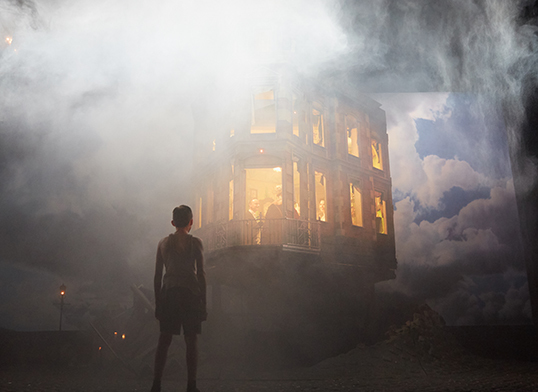 A broken house on broken ground. An empty street. A radio filled with music. The curtains at the Emerson Cutler Majestic Theatre rose to these strange sights. As they do, a heavy rain fell from above. The waters spattered onto a cobblestone pathway onstage while children kicked up the puddles made in the storm’s wake. A house stood in the middle of the mist that coated the stage. One could hear the sound of heels upon the cobblestone as a man in a trenchcoat approached the house, overflowing with the sound of merrymaking, and cast his shadow on the windowpane.