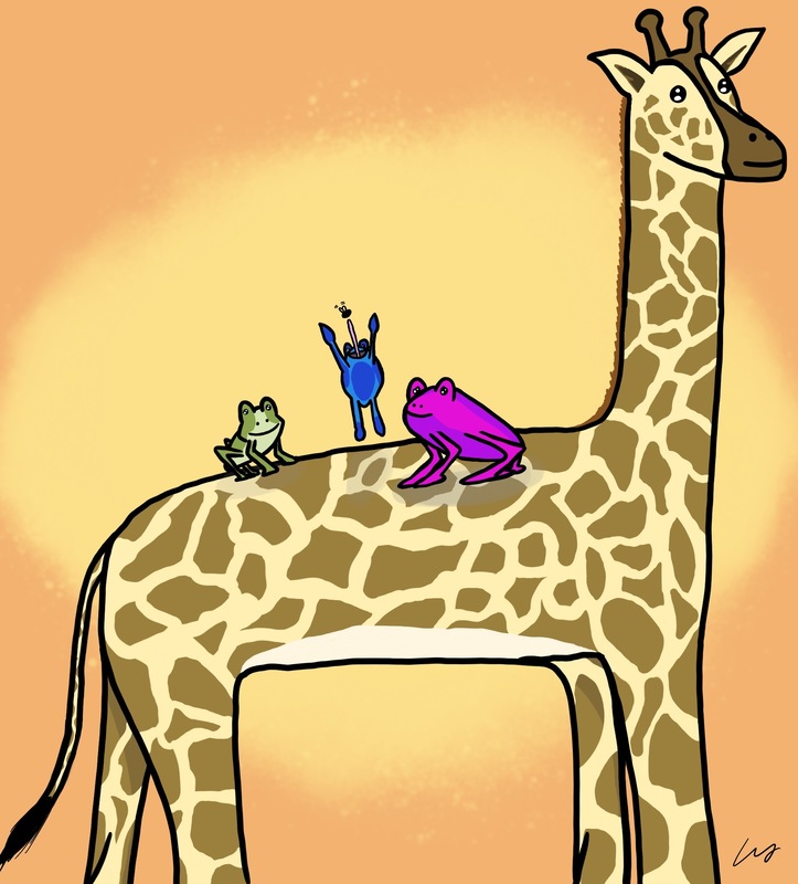 The cutest image just came to mind: an army of frogs riding a tower of giraffes. Ribbit.