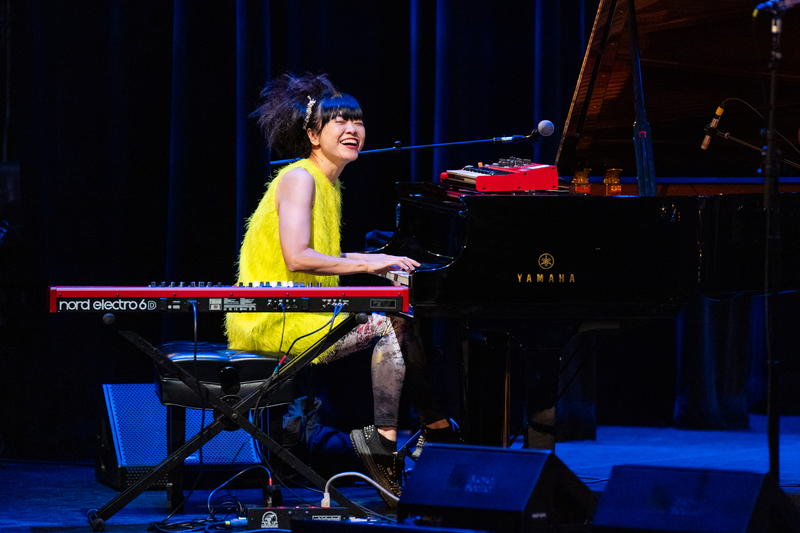 Hiromi entered the stage in a bold, shaggy lime-green dress, her hair swept up in a dramatic ponytail. With her hands on the piano keys, she was joined by her talented bandmates: bassist Hadrien Feraud, drummer Gene Coye, and trumpeter Adam O’Farrill.