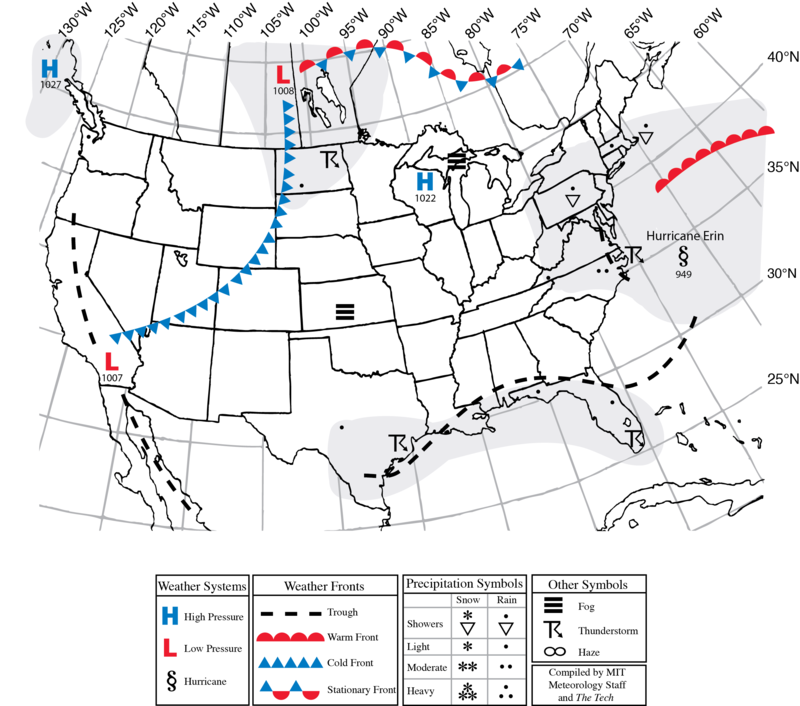 Why is it so cold in the middle of August? Well, the unusual combination of a polar air mass and a close pass from Hurricane Erin have brought some unseasonably cold and windy weather to campus this week. Following yesterday’s rain, today features stronger northeast winds––both associated with the hurricane’s broader influence. Erin will pass over 400 miles to our southeast on Friday, meaning no direct impacts. Out in the ocean, however, Erin is whipping up huge waves that will cause damaging surf up and down the eastern seaboard. The wave and rip current threat will be greatest for the Boston beaches on Friday and Saturday as the storm heads east and out to sea. Weather wise, this weekend will be pleasant with highs around 80°F and lots of sunshine. As for next week, Monday could feature some afternoon thunderstorms and temperatures will still be running slightly below average. This should make for a pleasant end to the month with highs in the 70s.