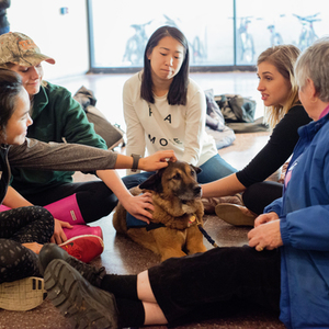 A community reflection held in Lobby 13 Wednesday afternoon featured drinks, cookies, therapy dogs, and an art project.
