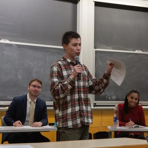 UA Vice Presidential candidate Anthony Donegan ’28 (center) gives his opening statement on Monday, March 16, 2026. Behind him are candidates Matthew Barnett ’27, Johnnie Jones VI ’27, Mariam Abdelbarr ’27, and Frances...