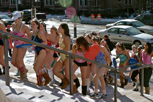 The MIT women's swimming team braves the 20°F weather as they start their annual run down the Infinite Corridor. The run is a traditon before the swimming NEWMAC Championships which will start today at Wellesley College.