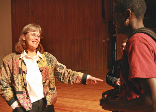 Amy Smith ’84 shares her experiences in Kenya with prospective freshman Kenyan Beneah Kombe after Smith’s CPW keynote speech in Kresge Auditorium on Thursday.