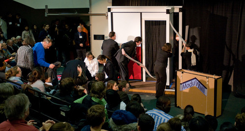 Members of the Yellow Team take down their ModuWall portable do-it-yourself wall system following their final presentation for the Product Engineering Process (2.009) on Monday evening. The wall system used vertical posts, composite panels, and flexible strips with industrial mushroom-head Velcro (used to attach armor to tanks) to provide privacy and sound isolation for roommates.