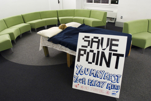Hackers placed a bed and accompanying sign marked “Save Point: You may rest your party here” in the student lounge adjacent to Lobby 10 in the Infinite Corridor on the morning of December 17. The bed was a reference to video game “save points,” as well as the approaching end of the Fall 2008 term and final exams.