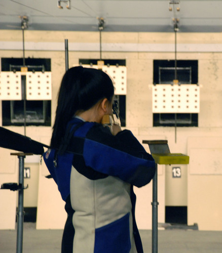 Justine Li ’10 takes aim with her air rifle at the 2008 Mid-Atlantic Conference Championship on Saturday in the duPont Athletic Center. Li scored 520 points to help the Engineers defeat Pennsylvania State University 2198-2176 in the Expert Division of air rifle.