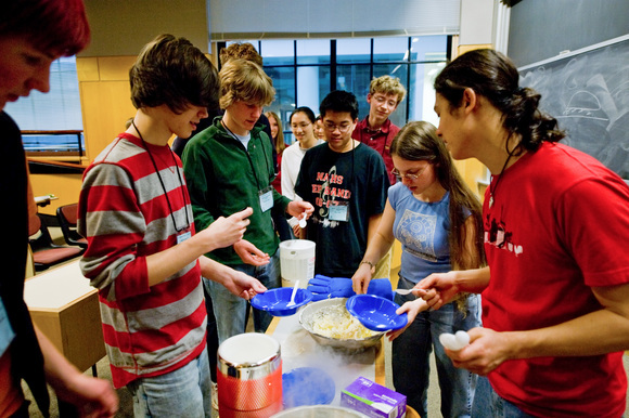 Students gather for liquid nitrogen ice cream after learning about the thermodynamic properties of liquid nitrogen and its effects on roses, tennis balls, and bananas. The class, entitled Applied Cryomania and taught by Joshua C. Velson ’10, was one of many offered to high school students through ESP’s Spark program on Saturday, Mar. 7.