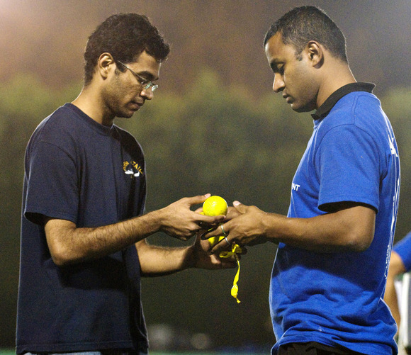 Srinivasan Jagannathan G (left) and Ankur Sinha G are seen preparing for a cricket match on the Barry Astroturf Field in this September 2008 file photo.