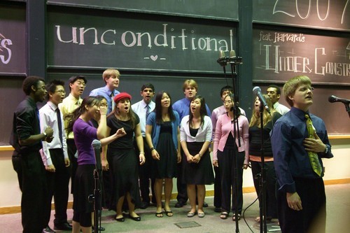 Daniel Wandel ’04 (right) sings a solo as members of the Cross Products croon along during their Saturday, May 12 spring concert.