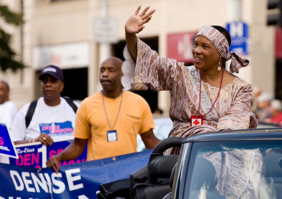 Cambridge mayor Denise Simmons waves to the crowd during the costume parade of the Cambridge Carnival International on Sunday. Mayor Simmons, up for re-election this November, was Grand Marshal of the parade.