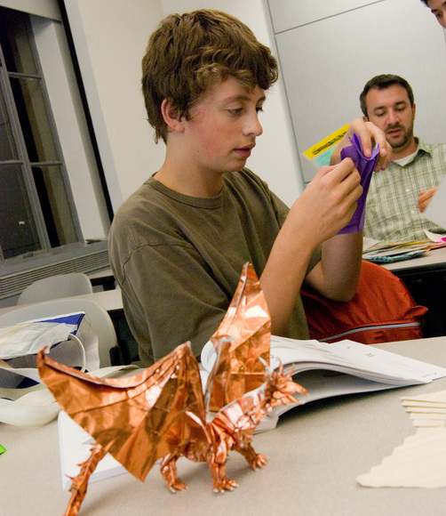 Jared Walz works on a model of a “chambered nautilus shell” with his “ancient dragon” in the foreground during a meeting of OrigaMIT, a campus origami group.