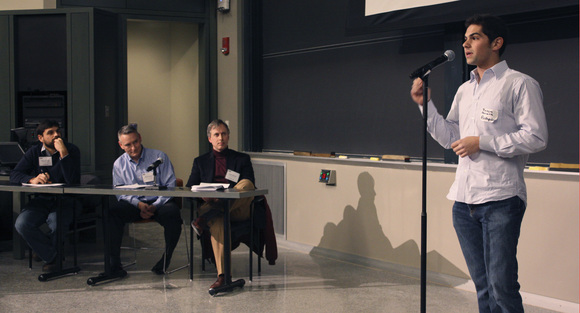 Jason Gurwin of Harvard Business school pitches his team’s idea to the audience and a panel of three judges at the finale of the MIT 100K Executive summary contest on Thursday in 10-250. He described his team’s business idea, which won the competition, as “the first social and competitive platform for savings.”