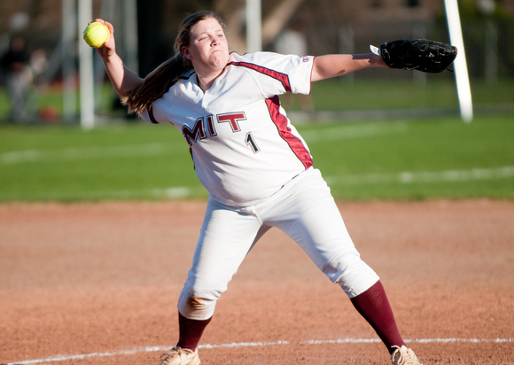 Jessica L. Iacobucci ’12 fields a ground ball during the softball game against Wellesley on Friday. The Engineers lost 1-6. Elijah Mena—The Tech