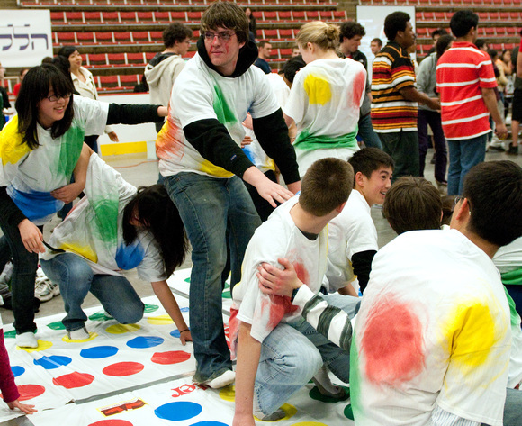 Prospective freshmen play a twisted version of Twister during the CPW Festival held in Johnson on Thursday. Participants in the East Campus-sponsored event wore T-shirts with twister dots on them, adding a human dimension to the Twister mat.