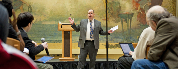 Associate Provost Martin A. Schmidt PhD ’88 speaks to Walker Memorial groups about the process for deciding whether Music and Theatre Arts will move into the building, and how students will be affected.
