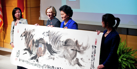 Chinese Councilor Yandong Liu presented MIT with gifts to honor the new MIT-China educational partnership, including a traditional-style Chinese painting and a collection of classic Chinese works. President Susan J. Hockfield gave the Councilor a glass pumpkin from the MIT Glass Lab.