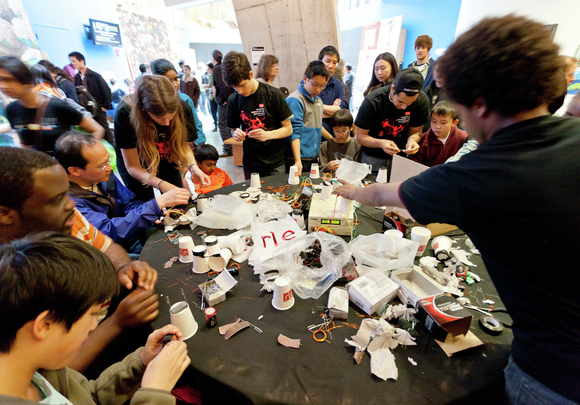 A team from the Research Laboratory of Electronics helped open house guests build a simple DC motor using insulated copper wire and ferromagnets in the Stata Center Saturday afternoon.