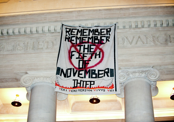 Hackers hung a banner on the inside of Lobby 7 commemorating the fifth of November. The Latin is five words beginning with the letter V, meaning, “By the power of truth, I, while living, have conquered the universe” — a reference to the movie V for Vendetta.