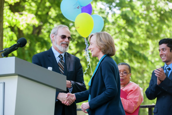 Chancellor Grimson shakes hands with President Hockfield after commending her various accomplishments as president.