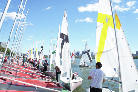 Students on the MIT Sailing Team prepare to take boats out on the Charles River on Sunday morning at the Walter C. Wood Sailing Pavilion.