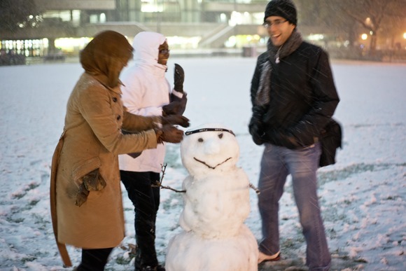 Snow fell for the first time this season on Wednesday night. Here, students build a snowman on Kresge Oval.