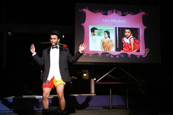 Anirudh Prabhu ’15 makes an entrance, pants down and a rose in his teeth, at the Camp Kesem Date Auction last Friday evening. Men and women of the MIT community are auctioned off to buyers in the audience in the event which is organized by Sigma Alpha Epsilon, and the proceeds go to Camp Kesem, a camp for children whose parents have or have had cancer. This year, the event raised over $7,600, over $1,000 more than the amount that last year’s auction raised.