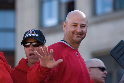 Red Sox Manager Terry Francona waves to the crowd during Wednesday’s Rolling Rally in Boston. The rally began at Fenway Park and made its way to City Hall Plaza in Duck Boats, stopping occasionally to let star closer Jonathan Papelbon perform his now famous Irish dance. See page 15 for more photos.