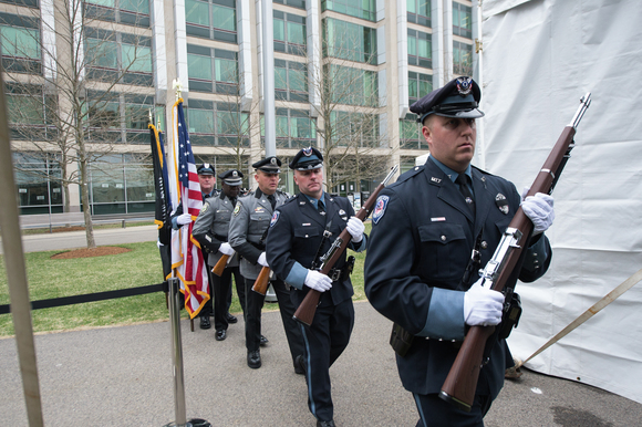 The MIT Police and Cambridge Police Joint Honor Guard presented the flags at the ceremony of remembrance for Officer Sean A. Collier held last Friday in MIT’s North Court.