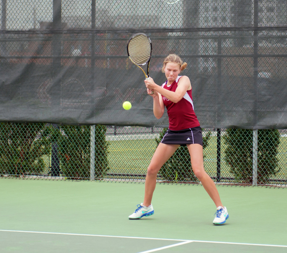Elysa M. Kohrs ’17 returns a shot during her 6-4, 6-2 victory over Sojung Lee from Wellesley this past Saturday. MIT went on to win the match 8-1 and remains undefeated so far this season.