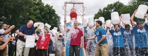 MIT President L. Rafael Reif, along with Provost Martin A. Schmidt PhD ’88, Chancellor Cynthia Barnhart PhD ’88, and members of the Phi Delta Theta fraternity complete the ALS Ice Bucket Challenge on Aug. 22.