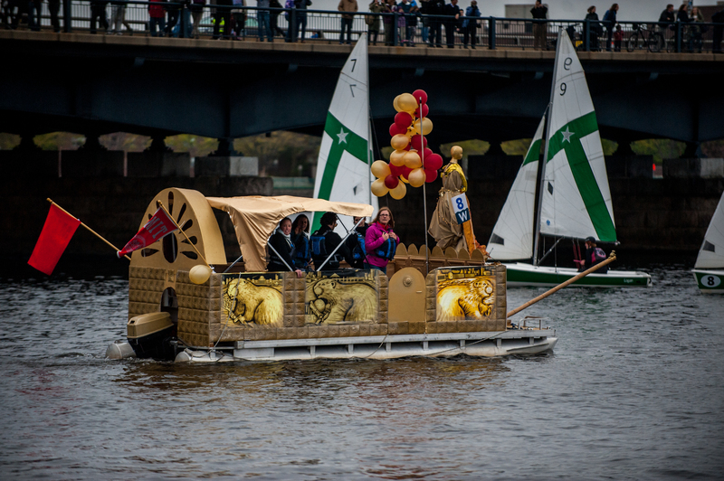 The 2016 Bucentaur makes it way across the Charles River during the Crossing of the Charles competition on May 7, 2016. The original 1916 Bucentaur was the boat that carried the Institute charter across the Charles River to MIT's current home in Cambridge.