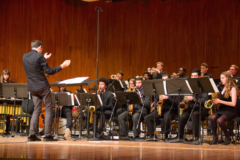 Music Director Frederick Harris Jr. leads the MIT Festival Jazz Ensemble through a night dedicated to performing pieces created by MIT students and alumni in Kresge Auditorium Nov 17.