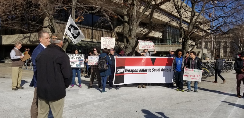 Vice Chancellor Ian Waitz looks on at a group of protesters outside the Student Center during xFair Monday. The protesters were rallying against xFair's inclusion of several companies, including Lockheed Martin and General Dynamics, that have sold weapons to Saudi Arabia.